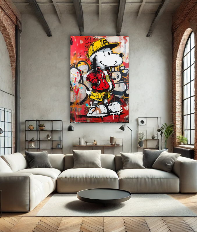 Dans un monde où les murs parlent et les icônes se réinventent, Snoopy débarque en mode streetwear, plus stylé que jamais. Casquette vissée, hoodie éclaboussé de couleurs, pantacourt flashy et chaussons oversize : cette version réinterprétée du célèbre chien devient un symbole pop et rebelle, posé avec assurance au cœur d’un fond graffiti éclatant.