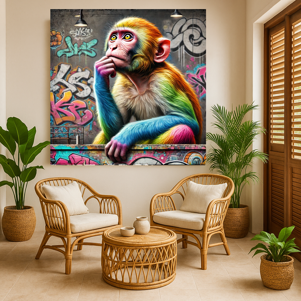 Quand la jungle rencontre la rue... "Think Different" est une Ćuvre percutante et pleine dâhumour, mettant en scĂšne un singe haut en couleur dans une posture de penseur urbain. DrapĂ© de teintes arc-en-ciel vibrantes, ce primate malicieux trĂŽne au cĆur dâun mur de graffitis, comme un clin dâĆil pop Ă la crĂ©ativitĂ©, Ă lâintelligence et Ă lâironie du monde moderne.