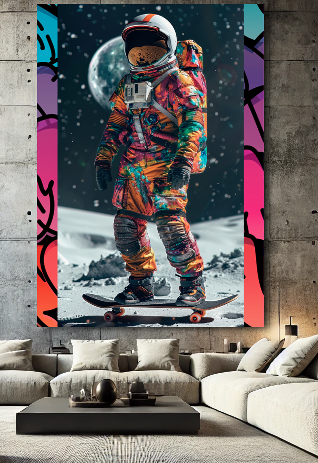 Cette œuvre vibrante et audacieuse mêle culture urbaine et exploration spatiale , offrant une explosion de couleurs qui rappelle l'énergie du graffiti et la liberté du street art. Chaque détail invite au voyage : la texture de la combinaison, les reflets du casque, et le contraste saisissant entre l'immensité noire de l'espace et la puissance des couleurs.