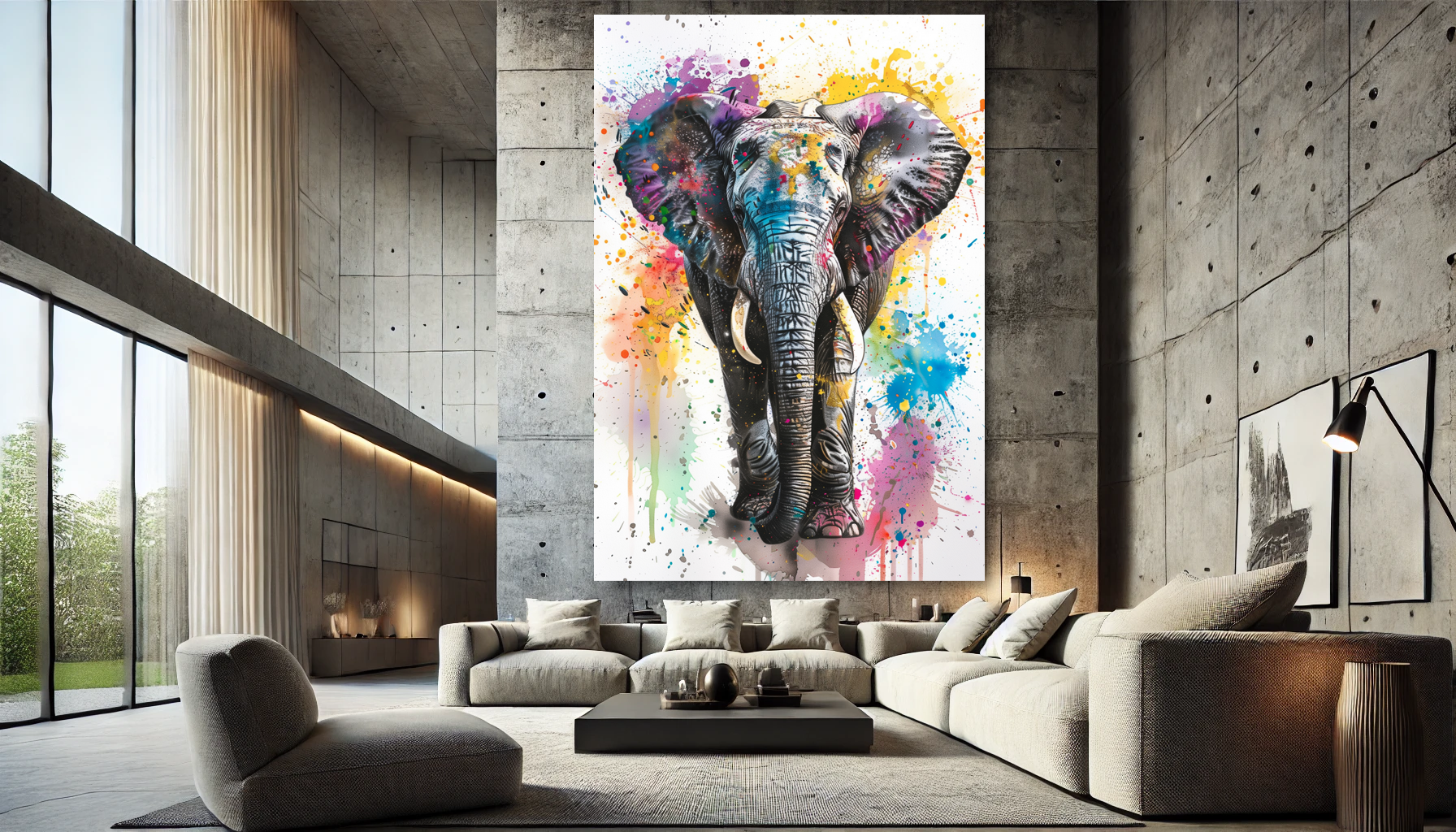 Puissant et majestueux, l’éléphant se dresse ici dans une version artistique éclaboussée de couleurs éclatantes.