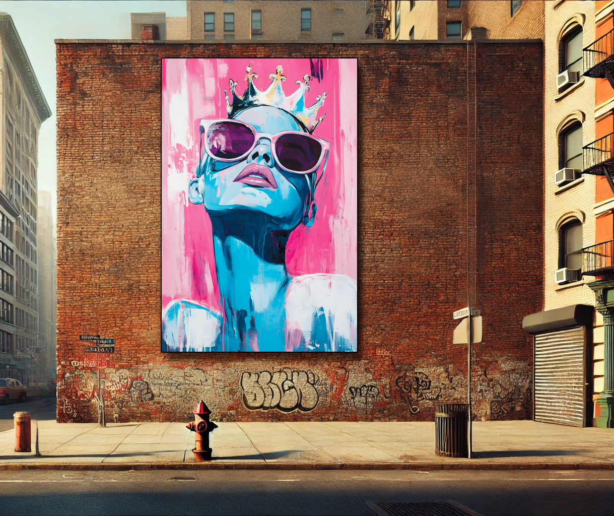 "Queen Energy" met en scène une femme couronnée, icône de puissance et de confiance, peinte dans une palette explosive de bleu électrique et de rose vibrant. Les lunettes oversize, la posture fière et le regard vers le ciel capturent l’attitude d’une reine moderne : libre, glamour et indomptable.