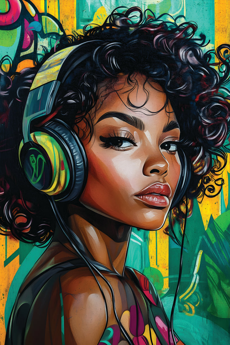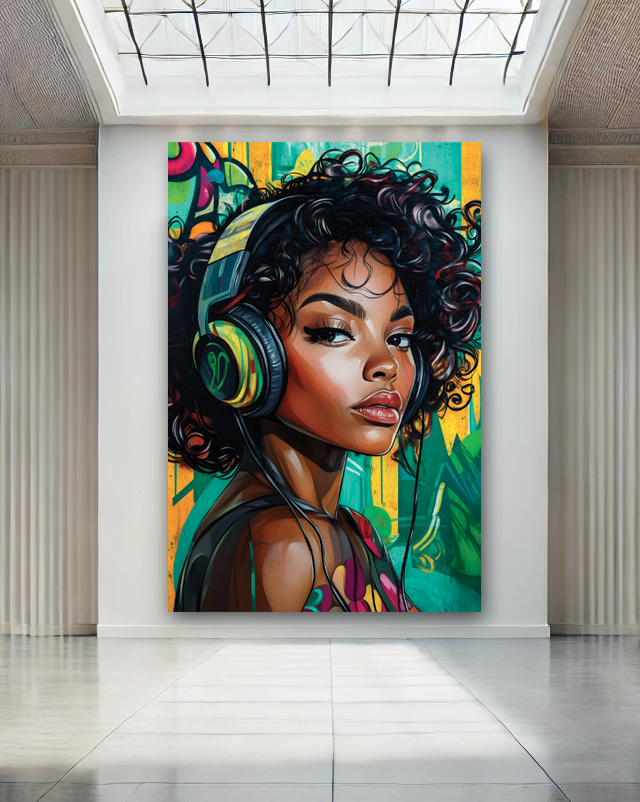 ĂlĂ©gante et vibrante, cette toile met en scĂšne une jeune femme charismatique plongĂ©e dans son univers musical.