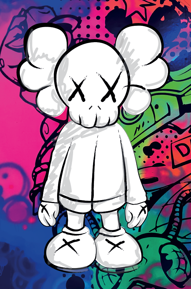 IcĂŽne pop et urbaine, ce personnage stylisĂ© aux yeux barrĂ©s dâune croix sâimpose sur un fond explosif de graffitis multicolores.